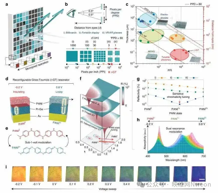 韩国研究团队研发出了一款可实现单个像素自主变色的低功耗单像素器件。所述技术像素密度最高可达16900 PPI,并有望用于实现 AR/VR 的超高分辨率显示屏。不过,器件目前的色彩表现稳定性尚不及商用显示屏。研究人员表示,目前可覆盖标准RGB色域的 48.1%,约为标准色域的一半。但通过优化材料组合,这一比例可提升至 69.9%。