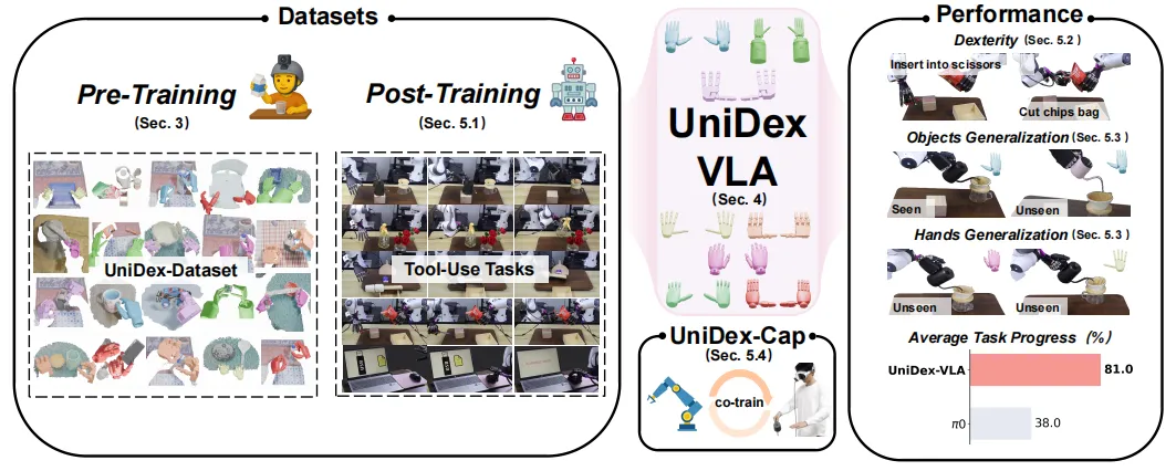 清华大学联合上海期智研究院推出 UniDex 通用灵巧手平台,实现机器人通过人类第一人称视频自学操作技能。该平台将海量人类日常视频转化为训练数据,通过人机协同重定位程序,解决人手与机械手形态差异问题,构建包含 5 万条操作轨迹、900 万帧数据的数据集,兼容 8 种异构灵巧手。团队提出统一动作空间 FAAS,实现策略跨手迁移,机器人可完成冲咖啡、剪袋子、用鼠标等 5 类任务,平均完成进度达 81%,较传统方法大幅提升。UniDex‑Cap 采集装置效率较传统遥操作提升 5 倍,降低训练成本。该成果为机器人灵巧操作提供通用底座,未来有望实现机器人 “刷视频学技能”,加速服务与工业机器人落地。