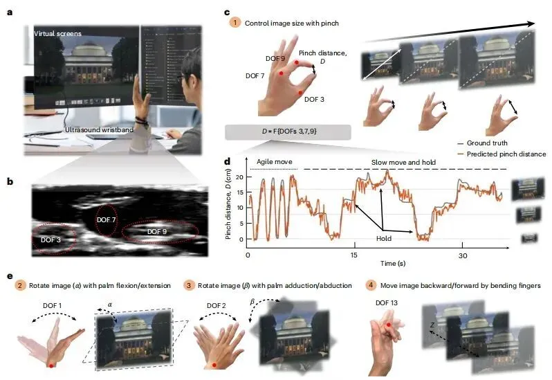近日,美国麻省理工学院赵选贺教授团队造出一款可以戴在手腕上的超声手环。当把手环戴上手腕,只需轻轻弯曲食指,旁边的机器人手指也能跟着弯下去。当活动五指弹一段旋律,机器人就能照着一模一样弹出来,比如真人食指按下 C 键,机械手也会按下 C 键。再动动拇指和食指,机器人就会用同样的手势捏住一颗篮球并投进桌上的小篮筐。据了解,这是第一次有人使用可穿戴超声技术连续追踪 22 个手部自由度,平均误差只有 3.78 度。如果这件事能够做成,未来只需戴上这只手环,就能在虚拟世界里像使用自己的手一样去抓捏和推拉。人类的机械手替身也许可以在千里之外代替我们去劳动,而我们只需要动动手指就可以。
