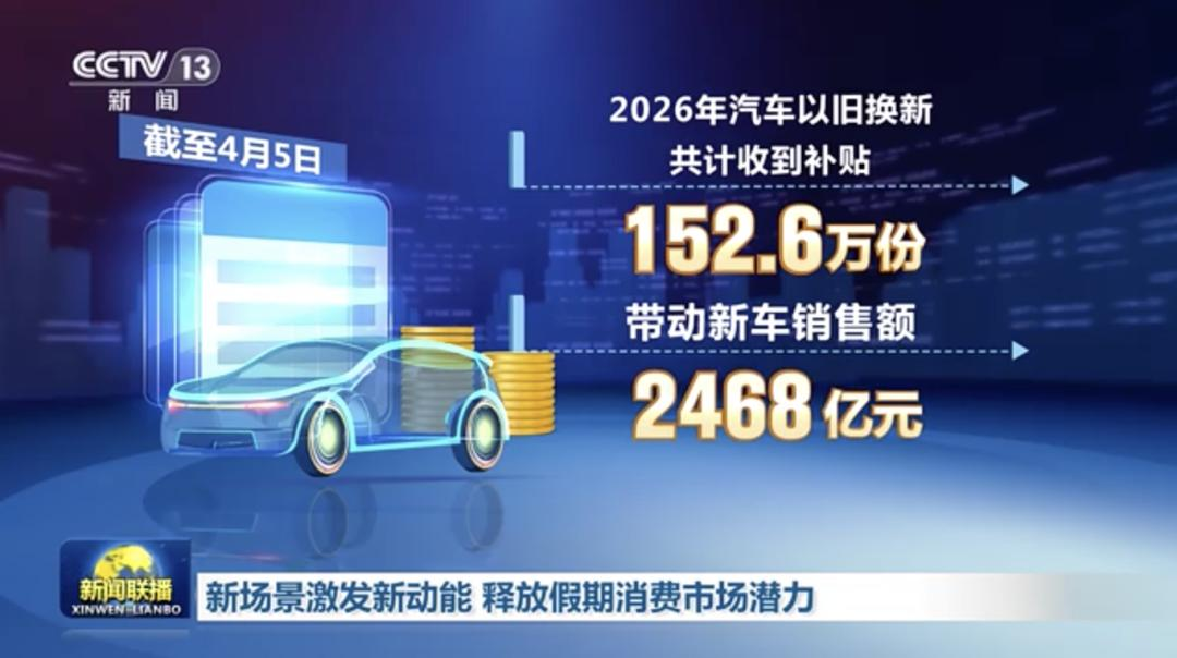 汽车以旧换新政策成为稳市关键,截至 4 月 5 日,该政策收到补贴申请 152.6 万份,带动新车销售额 2468 亿元。2026 年政策优化为按车价比例补贴,报废新能源乘用车最高补 2 万元,换购最高补 1.5 万元,精准拉动消费并优化车型结构。